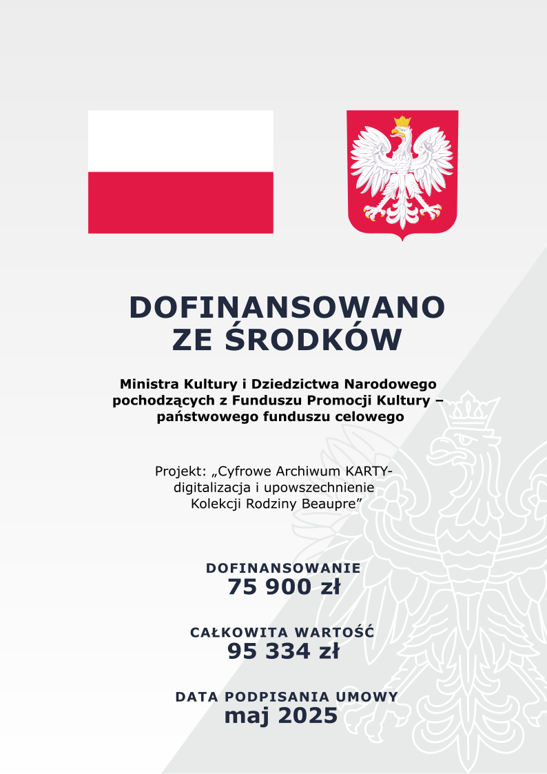 W ramach programu dotacyjnego Kultura Cyfrowa 2025 Archiwum Fundacji Ośrodka KARTA rozpoczęło realizację zadania „Cyfrowe Archiwum KARTY- digitalizacja i upowszechnienie Kolekcji Rodziny Beaupré”. Projekt polega na selekcji, digitalizacji 117 j.a. dokumentacji aktowej liczących 30 tys. stron oraz umieszczeniu zdigitalizowanych materiałów archiwalnych w internecie.